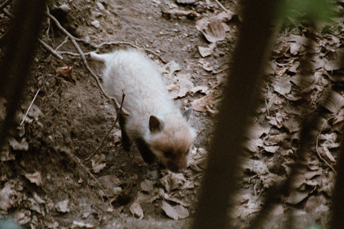 Eines Abends, kurz vor dem Dunkelwerden, erblickte ich die Fähe mit einer weissen Beute im Fang. Ein Huhn konnte es wohl nicht sein, mangels Volumen. Ich dachte zu erst an ein weisses Stallkaninchen. Doch falsch geraten, es war einer der weissen Fuchswelpen, der offenbar die Kraft nicht aufbrachte, den Erdhügel vor dem Fuchsbau zu erklimmen. Sicherlich auch ein Zeichen körperlicher Schwäche.